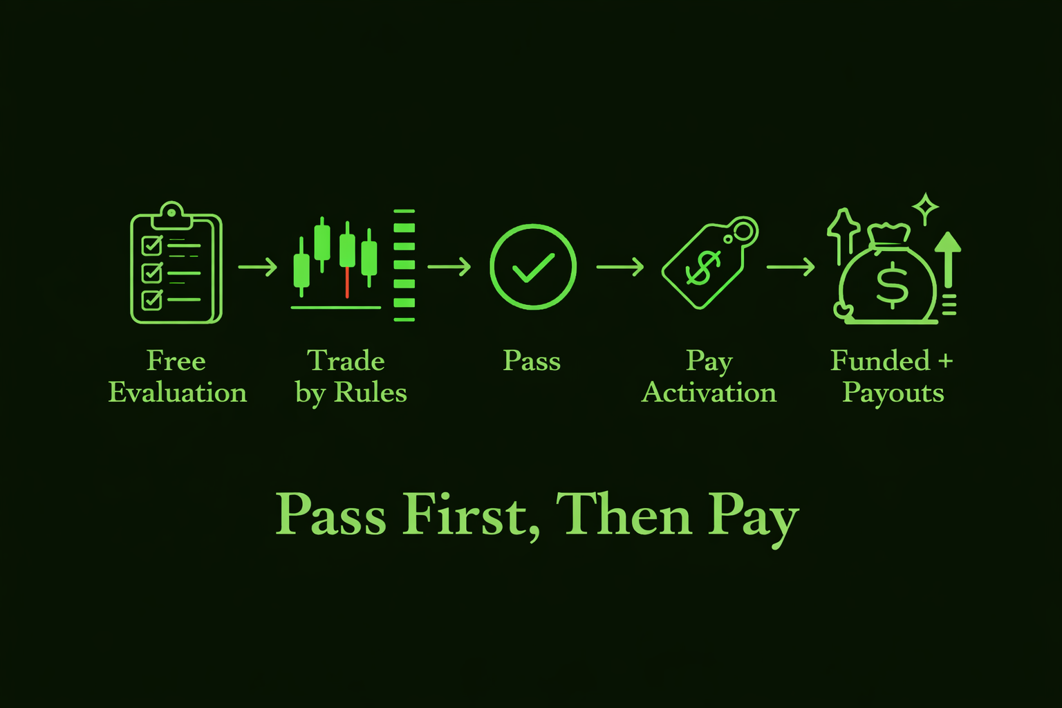 The trader starts trading without paying an upfront evaluation fee. During the evaluation, the trader follows risk and drawdown rules. If the profit target is reached without violating rules, the evaluation is passed, and payment is made to access the funded account.