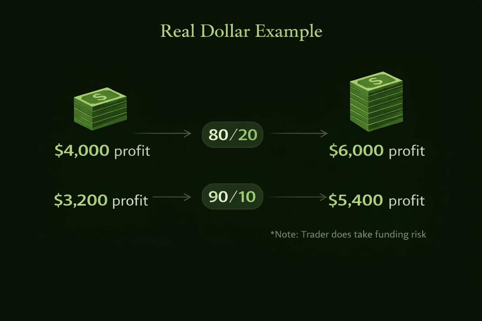 Example 1: Conservative Trader Earns $4,000 with an 80/20 split → takes home $3,200 Maintains account and builds long-term payout potential